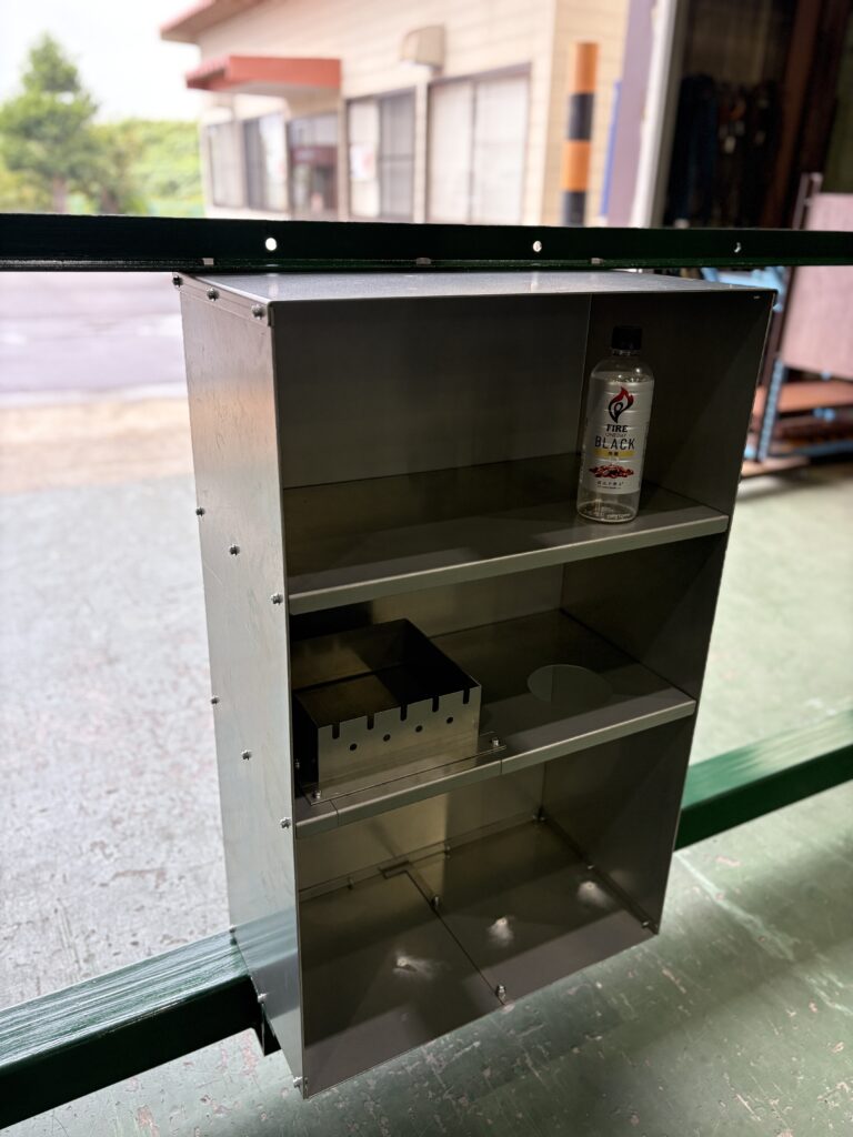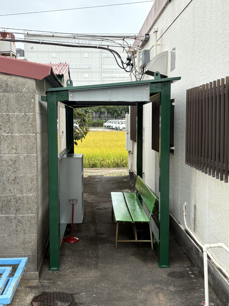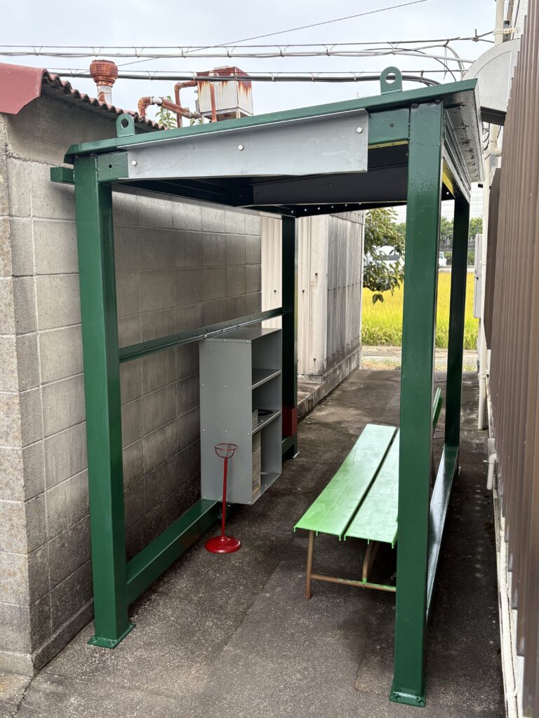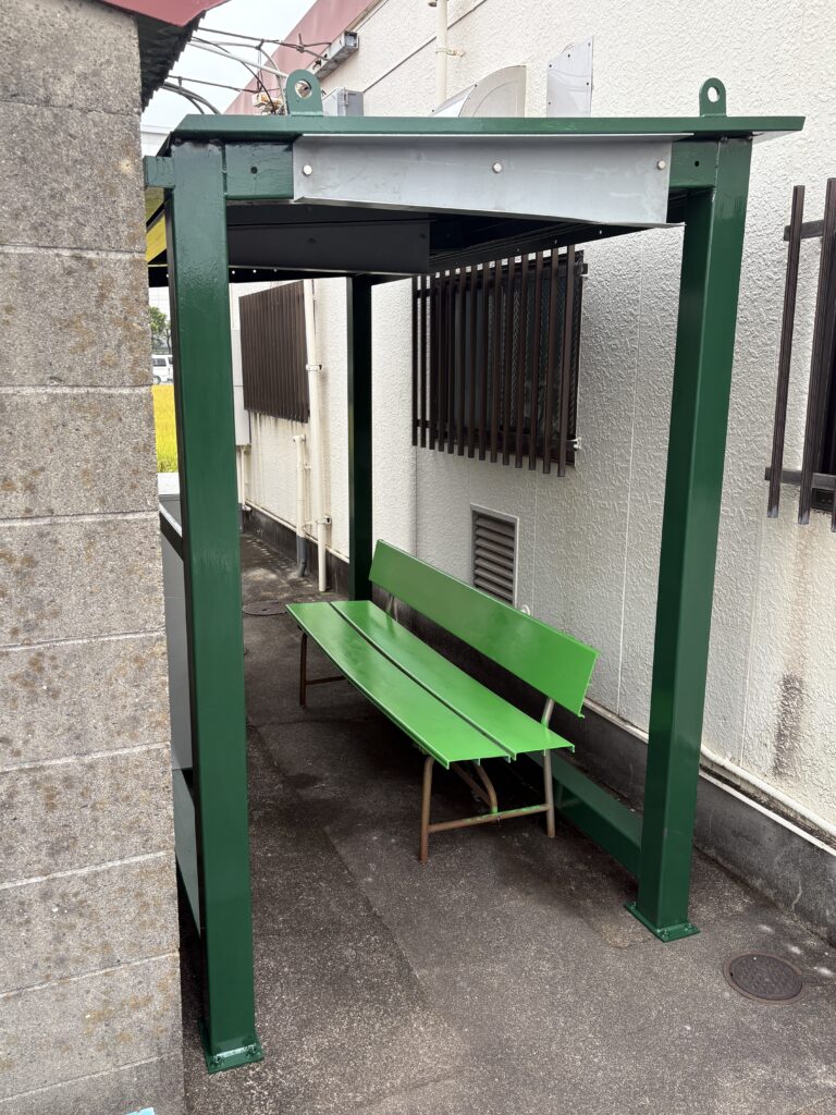 またしても、T係長が考えてくれました。立派な喫煙所が出来上がりました。屋根やドリンク棚なんかも設置されています。マウンテックのイメージカラーの緑で塗られています。喫煙者の方は是非お試しください。