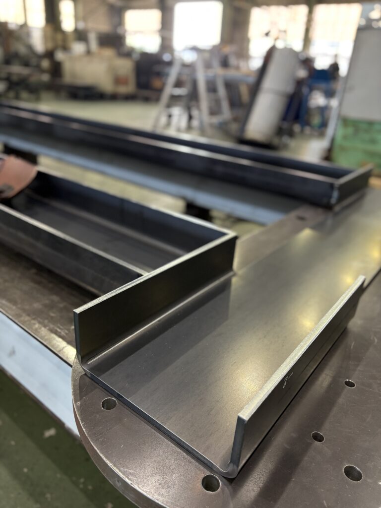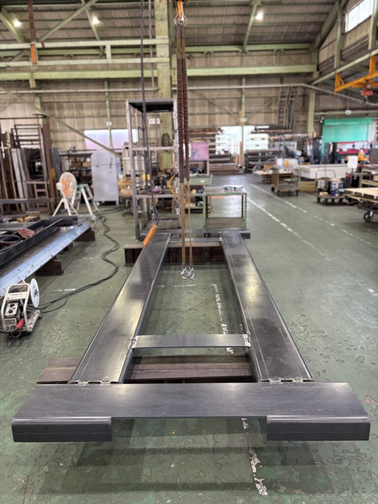 板の厚みが、12mmの鉄板を切断し、折り曲げて、溶接しています。穴位置の精度がとっても重要なので、溶接が終わってから全ての穴あけ加工をします。12mmの板厚で、長手方向3,630mmを曲げられる加工屋さんはなかなか無いですね。