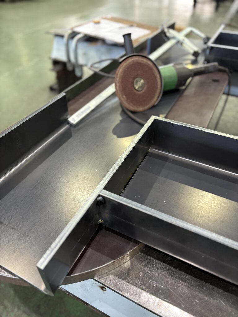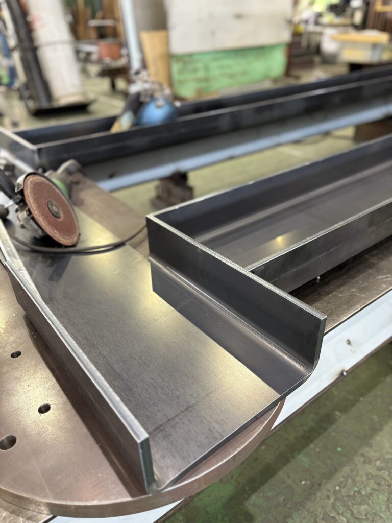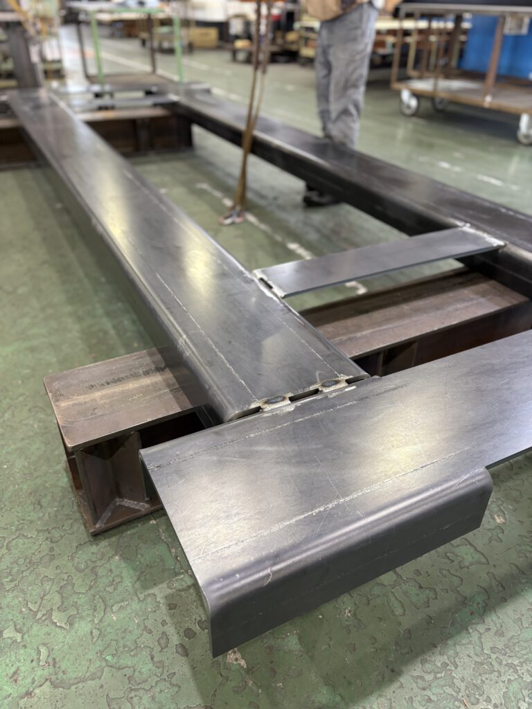 板厚12.0tの厚板を折り曲げたものを、溶接して架台を作っています。12mmの厚板で、長手方向3,630mmを曲げられる加工屋さんはなかなか無いですね。