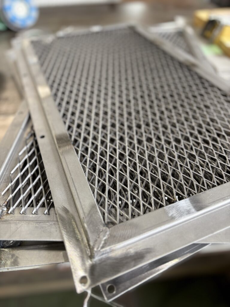 #エキスパンドメタル エキスパンドメタルを使用したカバーを作成しました。エキスパンドメタルは、鉄板へ千鳥にスリットを入れたものを両端から引っ張って作られたものです。網に当たるところが、もともと繋がっているため強度が高いです。板の厚みもいろいろとあるので歩廊の足場に利用されたりもします We’ve created a cover using expanded metal. Expanded metal is made by cutting a steel sheet with offset slits in a diamond pattern, then stretching it ...